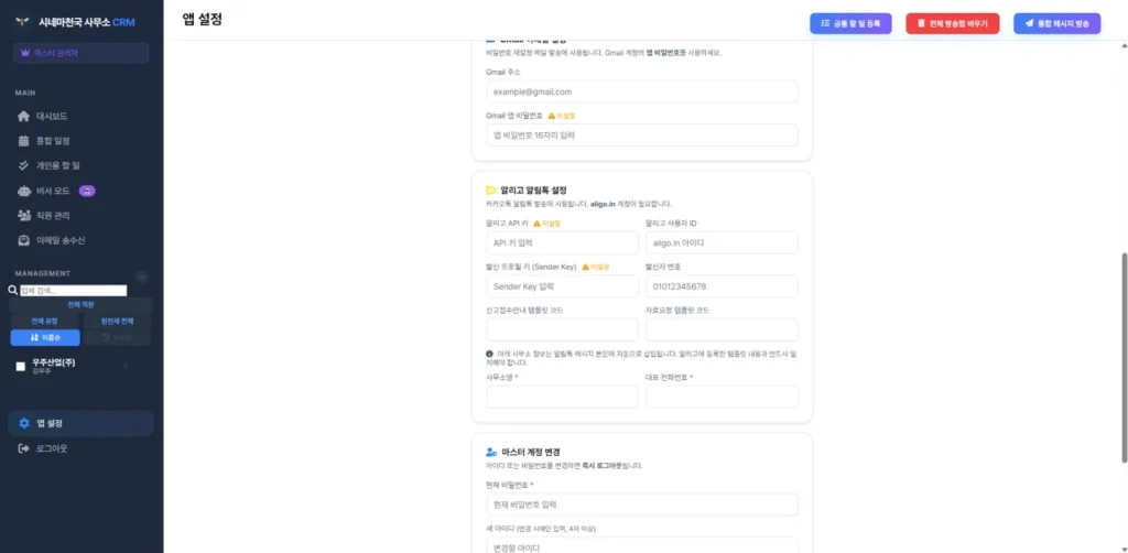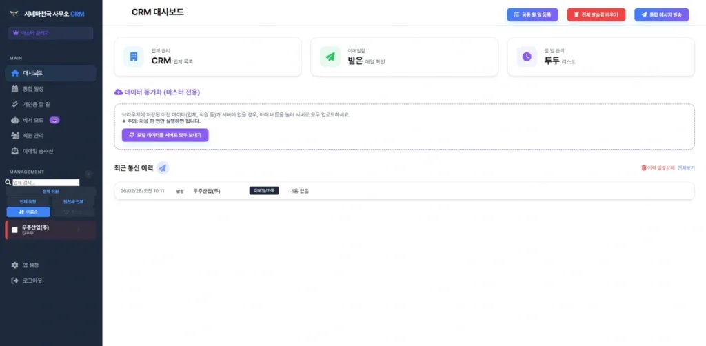 *대시보드 화면 – 최근의 발송이력이 보이고.. 데이터 동기화 창이(별 필요없다..개발단계에서 필요했던 부분) 보이고…