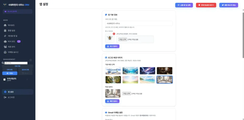 *앱설정 화면 – 다음으로 공을 많이 들인 부분이다.. 업체명 변경은 물론, 로고 변경, 바탕화면 변경(8개의 프리셋 화면포함) 지메일연동을 위한 입력창, 카카오톡(알림톡) 연동을 위한 입력창.. 등등…