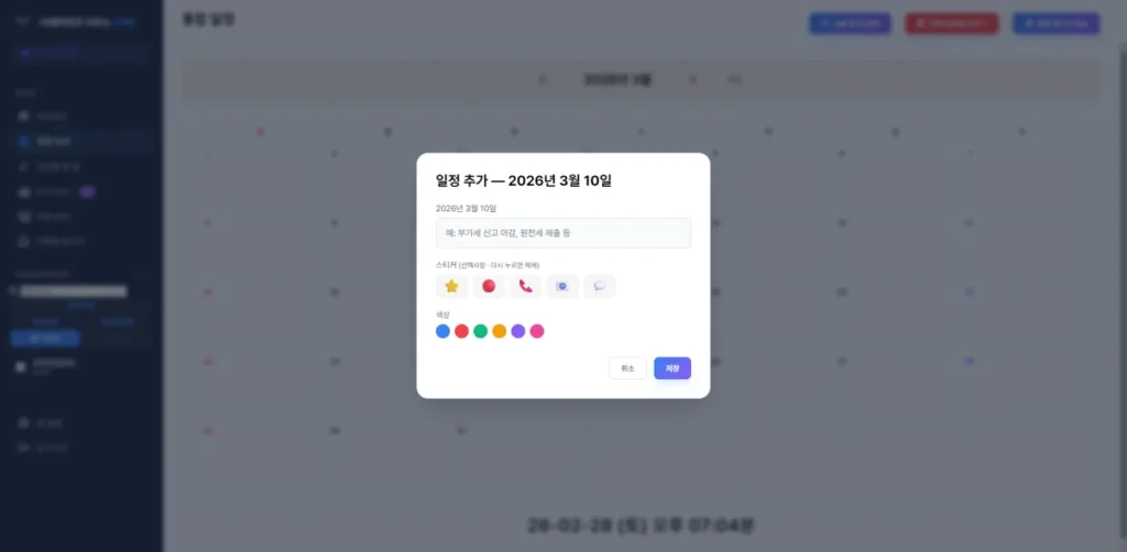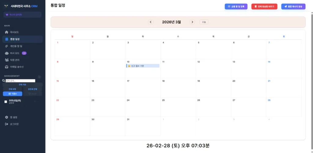 *통합일정 – 월별 해야할일 등을 입력할 수 있다. 기록된 내용 중에 업체명이 있으면 업체별 할일에도 자동 등록된다