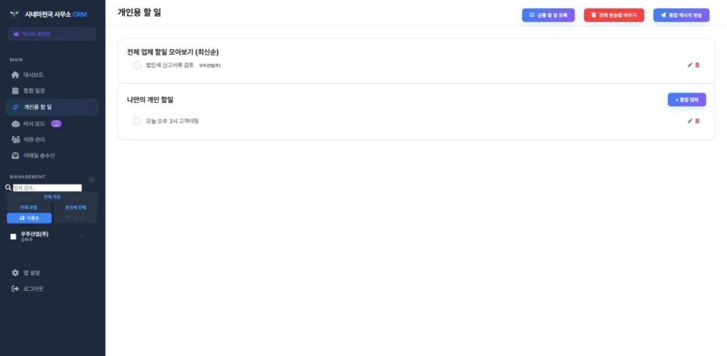 *개인용할일 – 상단에는 업체별 할일 리스트와 연동된 내용이 뜨고 하단에는 개인할일 창이 뜬다.