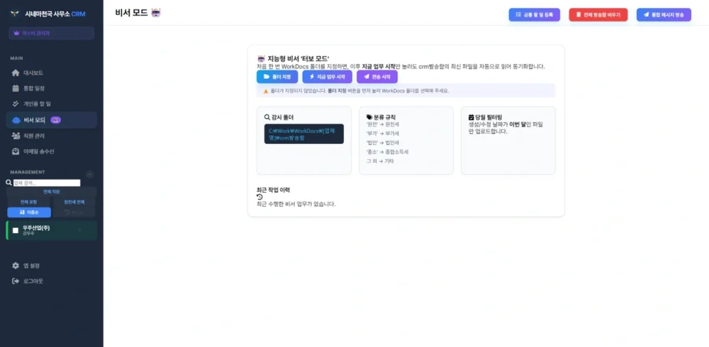 *비서모드 – 내가 이 앱을 기획 구상하고 개발한 가장 중요한 이유이자 가장 공을 들인 부분이다. 이른바 비서모드… 내 컴퓨터에 업체별 폴더에 그 달 그 달 생성한 문서들을 저장해 놓고 업무시작 버튼을 누르면 세목별로 알아서 구분해서 업체별 발송함에 업로드 시켜 준다. 그러면 왼쪽 업체별 명단에 초록색 불이 들어온다