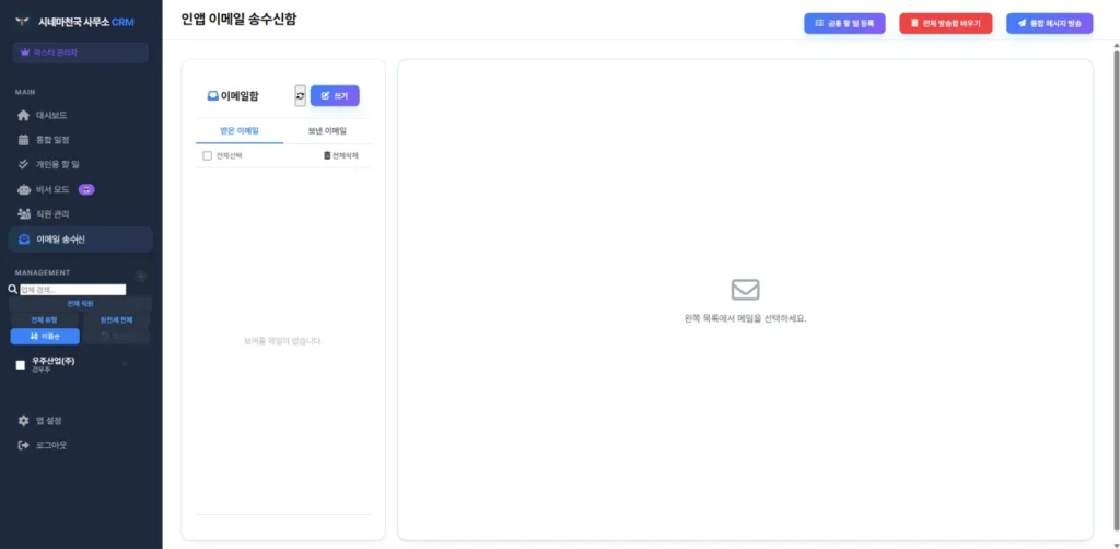 *이메일 – 업무 특성 상 이메일을 많이 사용하는데.. 그냥 이 안에서 이메일 수신, 발신이 다 되도록 구현해 놓았다.. 웹브라우저 나 메일 앱 따로 열고 메일 주고..받고 할 필요없게… 업체에서 들어오는 메일에 첨부된 자료는 자동으로 그 업체의 수신함에 가서 쌓인다…