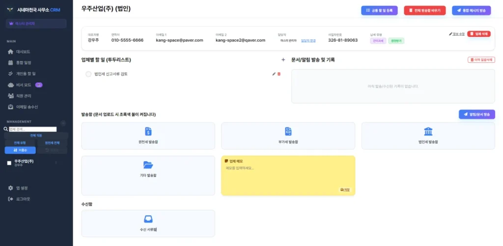 *업체별 보드 – 간단하게 업체별 메모를 할 수 있는 포스트잇도 만들어 놓았다.. 좌측에 정렬탭에 따라 개인, 법인, 원천월납, 반기납 또는 담당직원별로 정렬해서 볼 수도 있다..